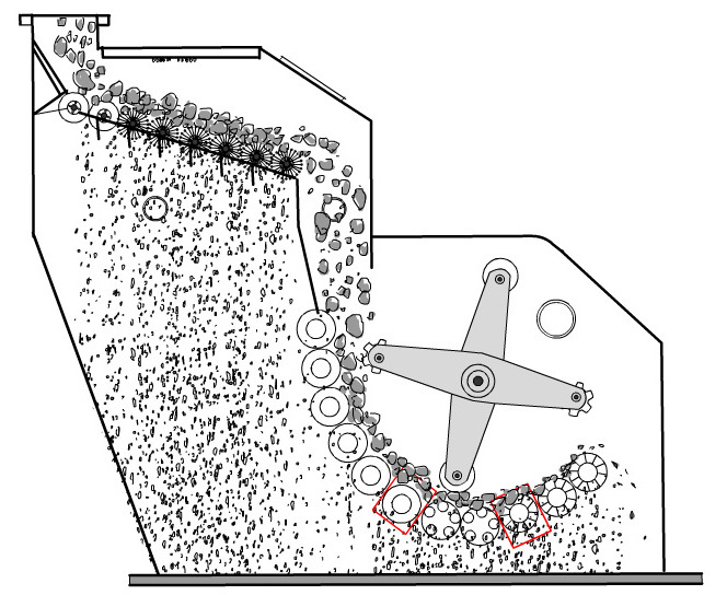 破碎物料進(jìn)入粗破的形式,由粗輥與反擊板相互刮削打擊運(yùn)動(dòng)使大塊物料破碎,然后進(jìn)入篩分系統(tǒng)達(dá)到粒度要求的直接送進(jìn)鍋爐,未過到要求粒度的再進(jìn)行到細(xì)破置進(jìn)行破碎,兩細(xì)破輥?zhàn)酉鄬?duì)差速運(yùn)轉(zhuǎn),具有相互刮削作用而強(qiáng)制排料,采用原料自由落差,全進(jìn)全出,對(duì)物料水分無任何要求。